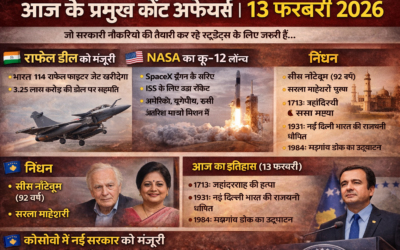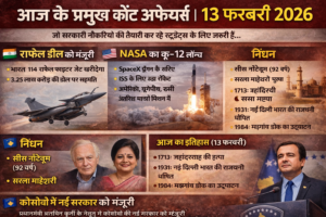 Today Current Affairs आज के दौर में करेंट अफेयर्स हर प्रतियोगी परीक्षा के लिए बेहद जरूरी हो गए हैं। 13 फरवरी 2026 के प्रमुख राष्ट्रीय और अंतरराष्ट्रीय घटनाक्रमों में रक्षा, अंतरिक्ष, राजनीति और महत्वपूर्ण व्यक्तित्वों से जुड़ी कई बड़ी खबरें शामिल हैं, जो स्टूडेंट्स के लिए खास महत्व रखती हैं। 🇮🇳 नेशनल अपडेट राफेल फाइटर…